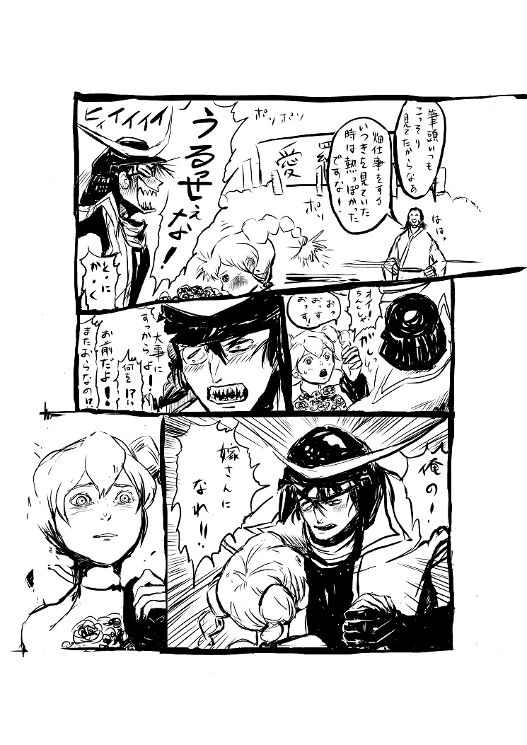 村長が怒っているのは、目にいれても痛くないほどかわいだっていたいつきちゃんが優しくしてくれたお侍さんに恩返ししてくるって言ってきかないから許してあげたんだけど、本人みてみたらいかにも不良のヘッドなわけですよ。愚連隊なんてマジ許せん。絶対いつきちゃんのこといいようにもてあそんであいつポイするにちげぇねぇ、おおいつきちゃん。ってなわけです(何が)