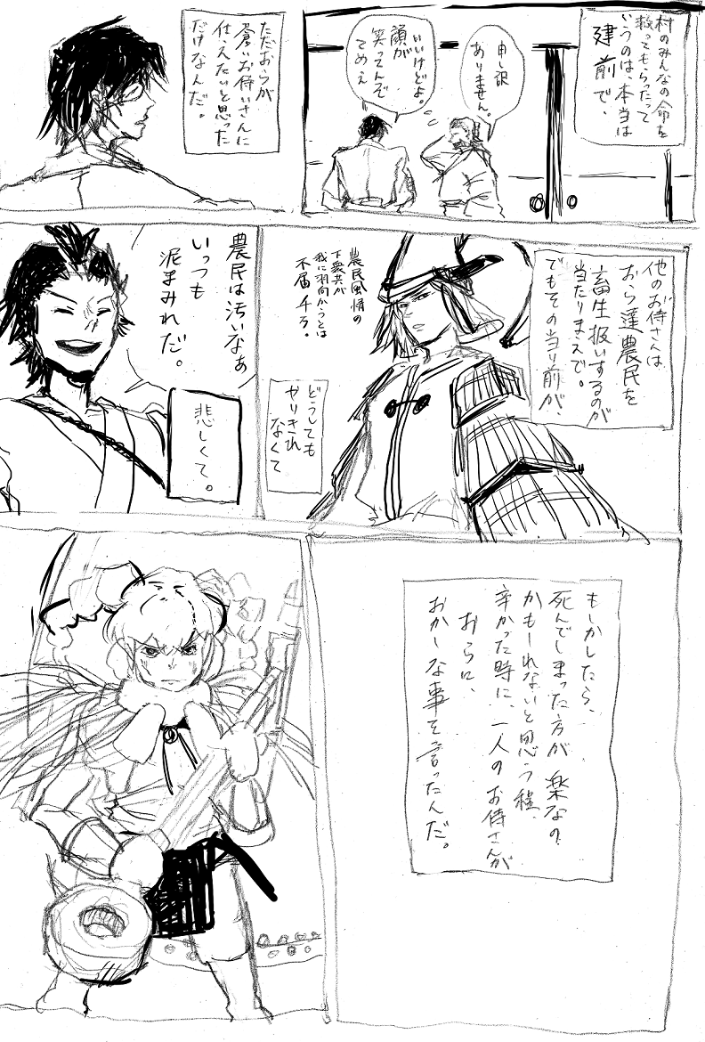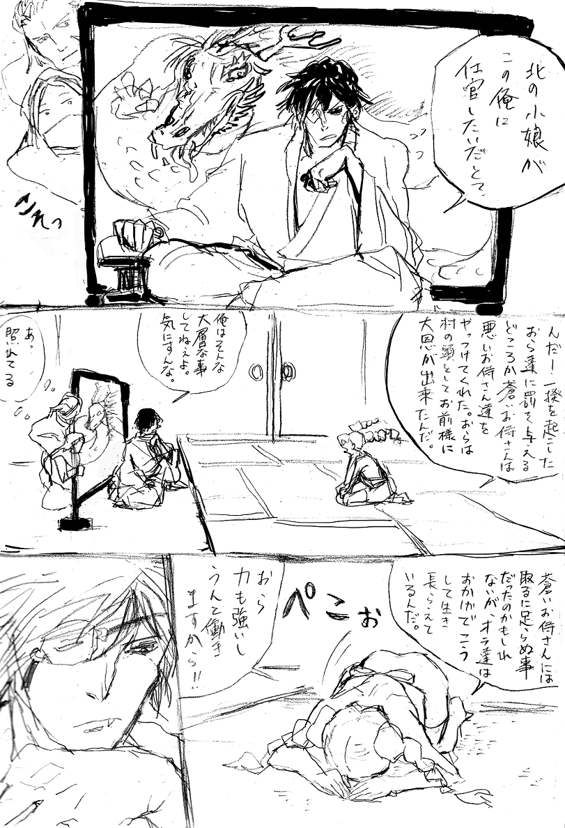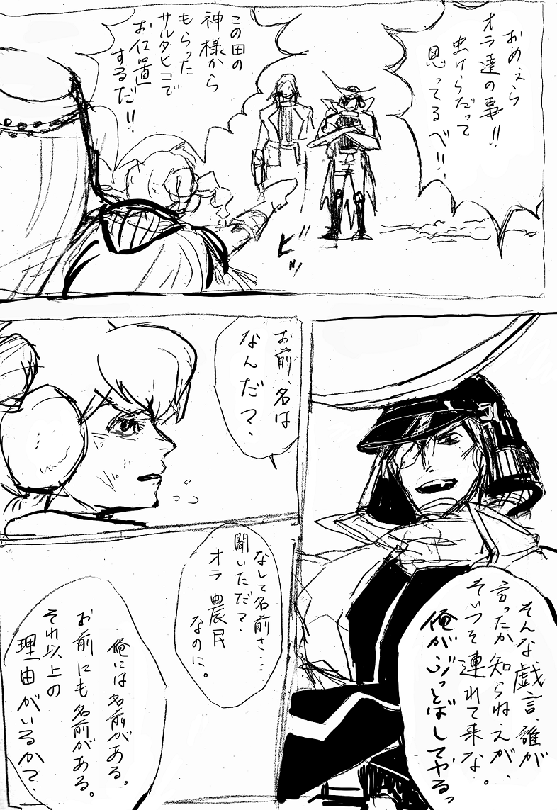 いつきが伊達に仕官した理由のお話です。まさかの伊達いつの超重要台詞を、鉛筆で走り書きでござる。スピードと手軽さをとりました。(てめぇ)A4のノートにごりごり描いた。ごりごり。いつきは伊達に恩返しがしたい。