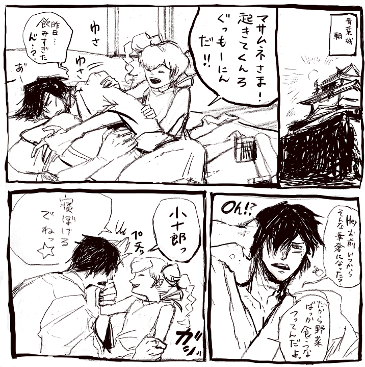 青葉城に無事仕官の叶ったいつきが片倉小十郎が申し付かった仕事は、毎朝みんなを起こす仕事。伊達軍のみんなを起こして、片倉様を起こして、最後に政宗様を起こしに行くいつき。