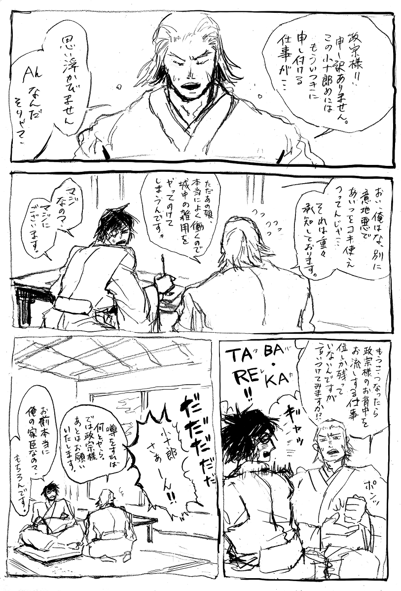 これがキャラ崩壊ってやつか。なんか小十郎に「よる年波」みたいなものをみつけたりすると、途端弱くなる伊達っていい(笑)