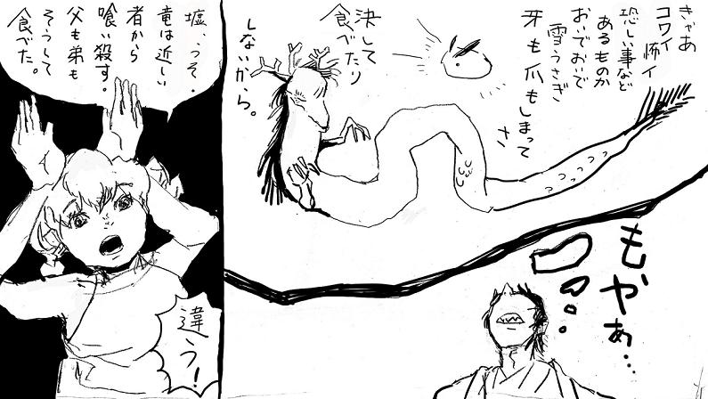 これは描きたかった気がするんだけど、できるだけ簡潔に話を進めたいのでカットされました。まぁ話はだいたいもう残りもわずかだしね。なんとかかんとか。あっ形探ってるからつのが三本もある。やっちゃったなぁ。